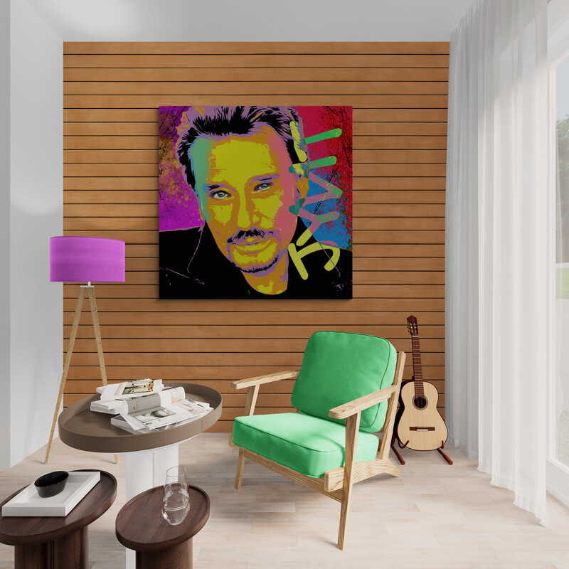 Johnny Hallyday . An interplay of light, color, and intuition, captured in 100×100 cm of pure intensity. Printed on tempered safety glass, the artwork reveals its secrets with every glance: colors that seem deeply alive, clear, and permanently radiant. Our glass is seven times stronger than regular glass and twice as heavy as acrylic, ensuring every detail remains scratch-resistant, colorfast, and crystal clear. An eye-catcher that not only fills a room but also whispers a story that slowly unfolds.